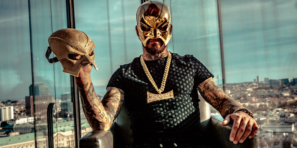 „Ich bin ein Junge von der Straße und noch nicht ganz von der Straße runter und habe noch viel zu verbergen.“ Am 7. April 2017 erreichte sein zweites Studioalbum Pusha Platz 4 der deutschen Charts. 18Karat hat sich vom Newcomer zum erfolgreichsten Road-Rapper Deutschlands entwickelt. Der erfolgreiche Rapper hat in den letzten Jahren wiederholt bewiesen, dass es ihm finanziell an nichts mangelt. Laut vielen Fans ist 18Karat einer der „echtesten“ Rapper der deutschen Hip-Hop-Szene. Trotz seines musikalischen Talents ist sein bekanntestes Erkennungszeichen seine goldene Maske. Seine Maske ist untrennbar miteinander verbunden, genau wie ein spartanischer Kämpfer und seine Kopfbedeckung. Mittlerweile ist er nicht nur Rapper, sondern auch Labelchef. Höchste Zeit also, seiner Maske ein weiteres Update zu verpassen und seinem Status in der Szene gerecht zu werden. Eine neue, verbesserte Folge seiner Maskenserie. 18Karat hat sich an Aporro gewandt, um seine aktuelle Maske zu einer vollständig vereisten 18K VVS-Diamantenmaske aufzuwerten.